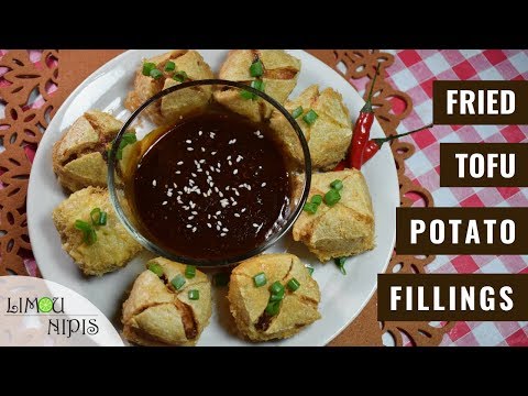 FRIED TOFU WITH POTATO FILLINGS - Tofu Potato Balls - Recipe: - 500g potatoes (boiled until tender) - 16 dried tofus ( take out the fillings) - 1 1/2 cup minced chicken - 1 dutch onion (diced) - 2/3 cup scallions - 2 red ...